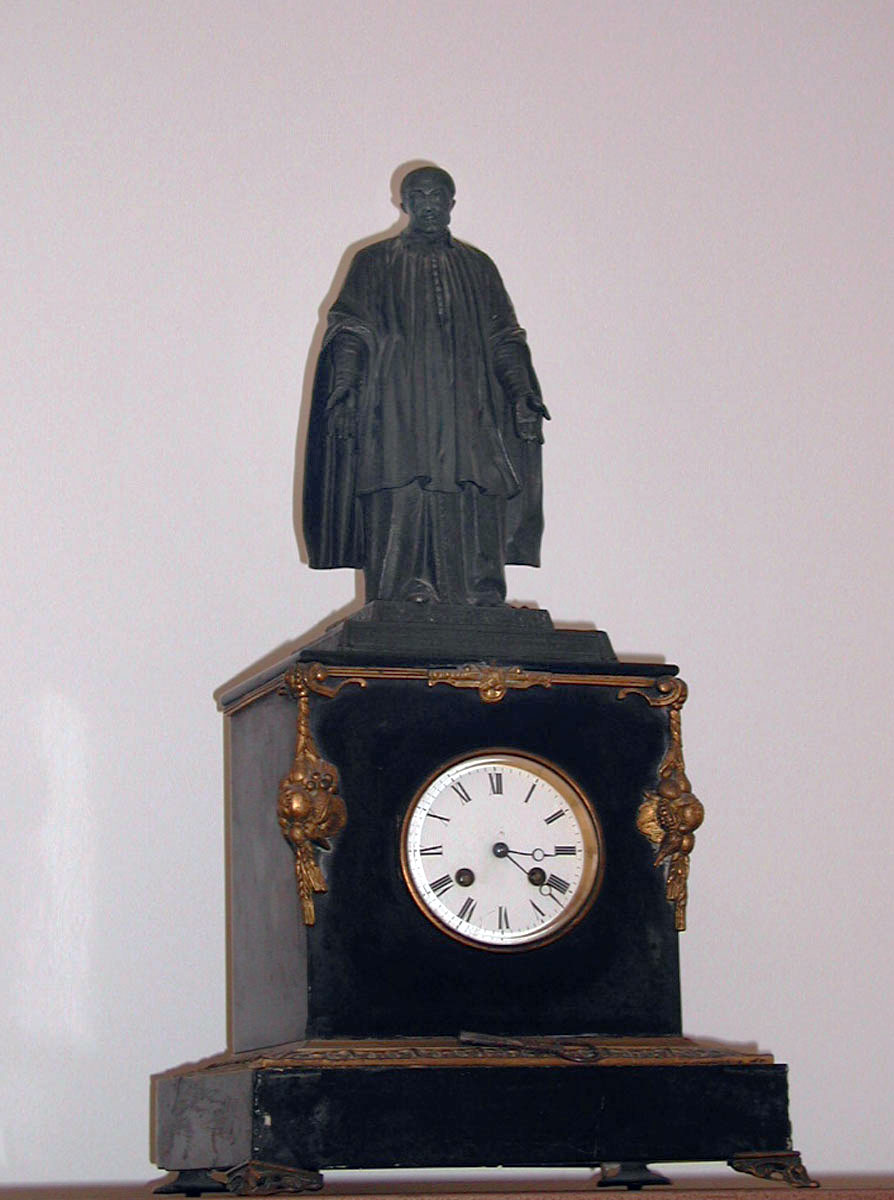 Bronze, Vincent de Paul, standing, cassock, surplice, skullcap, arms down in gesture of welcome; original in Vincentian provincial residence, Lisbon