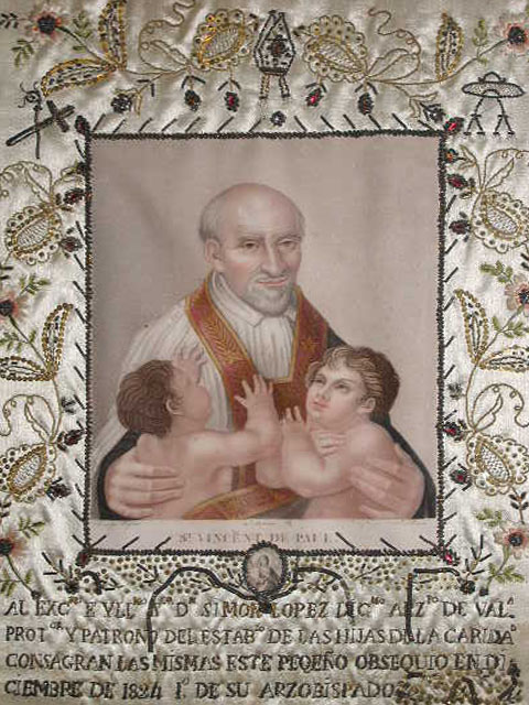 Painted cloth (or colored print) in embroidered border; Spanish text; gift to new bishop of Valladolid, 1824; original in Daughters of Charity museum, Zaragoza