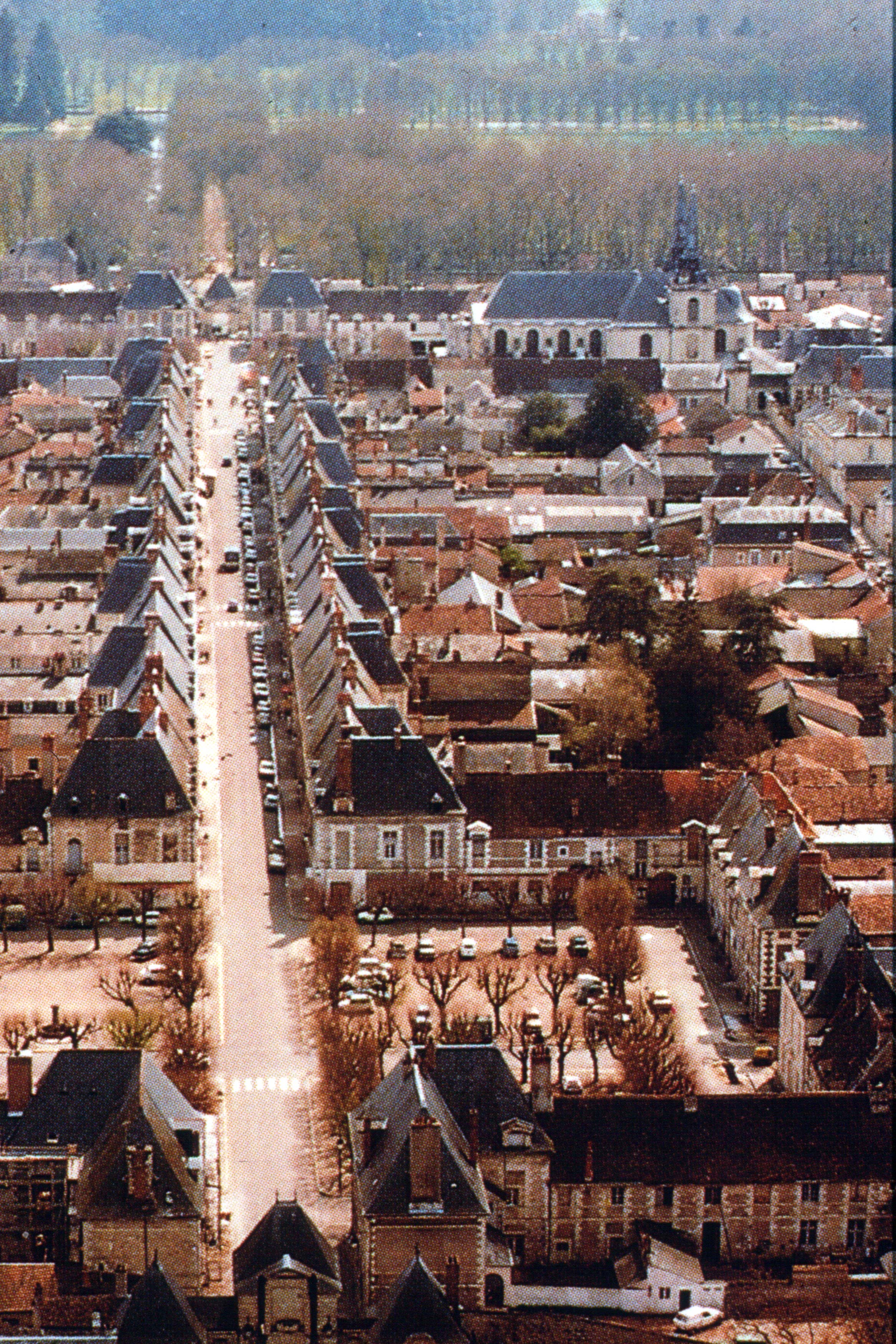 Richelieu, vue aŽrienne, la grand'rue entre les deux portes principales, ˆ droite, au chevet de l'Žglise, la maison des Confrres du temps de saint Vincent.