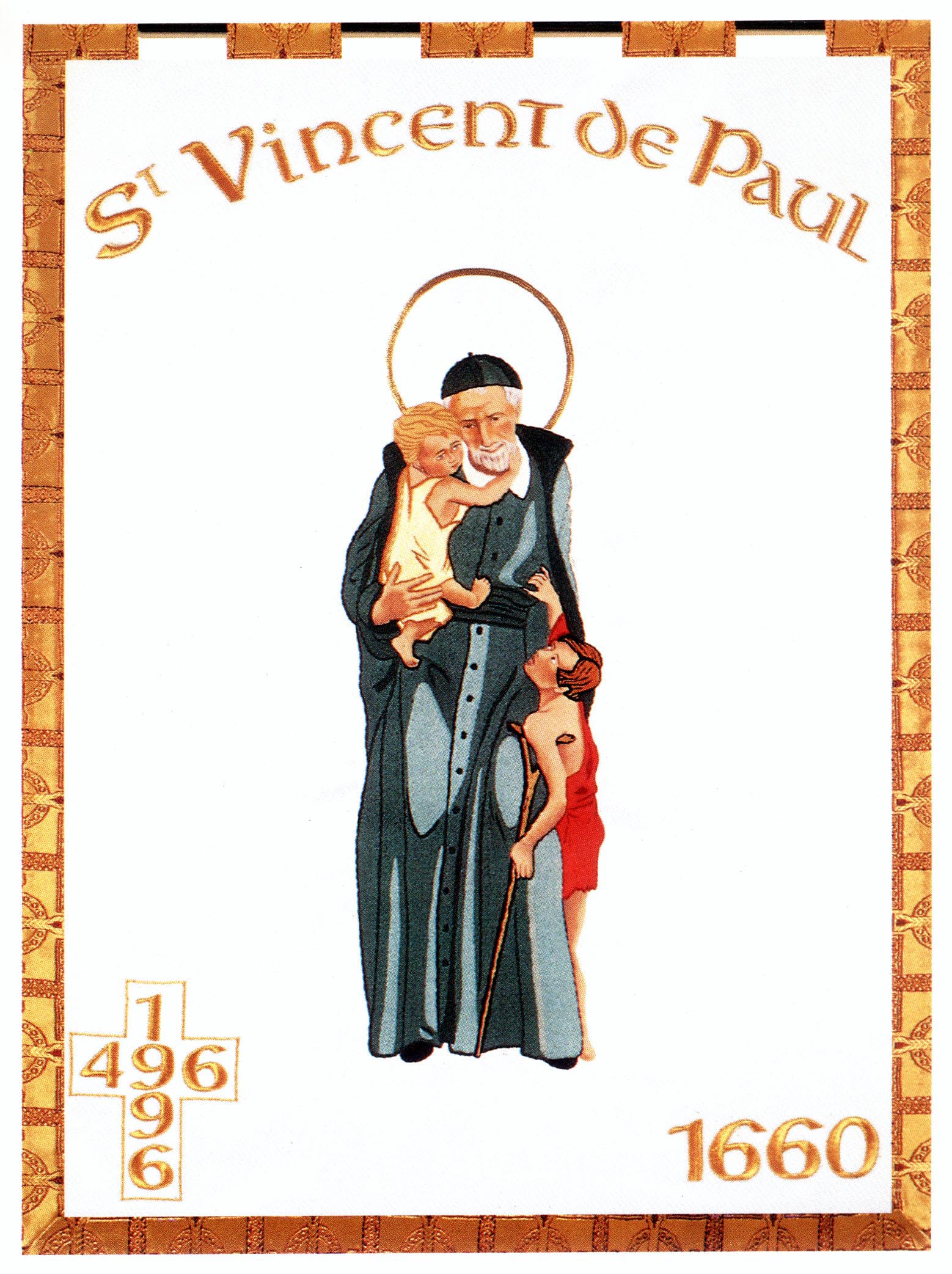 Illustration from book of banners; Vincent de Paul, standing, cassock, cincture, mantle, skullcap, halo, with two children; 1996