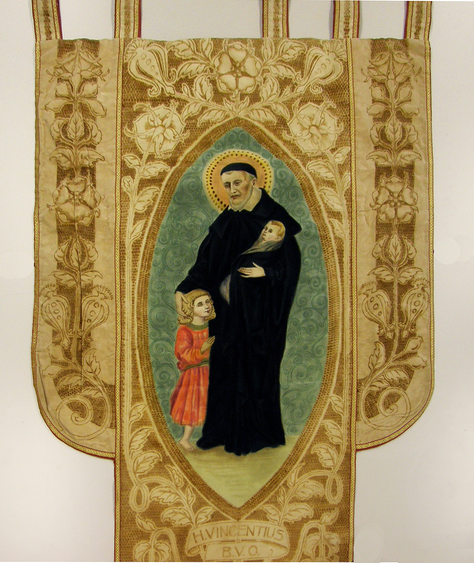 Painted cloth banner; Dutch text: St. Vincent, pray for us. In DePaul University collections