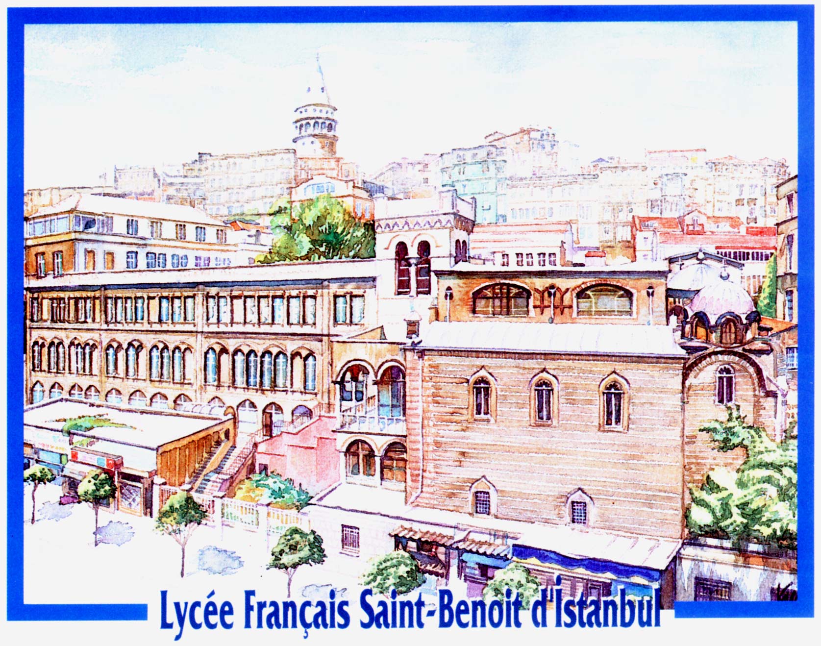 Faade du collge St-Beno”t d'ISTANBUL. la tour carrŽe, le pŽristyle ˆ colonnades, les coupole de l'Žglise sont les parties les plus anciennes. Dans le fond la tour de Galata.