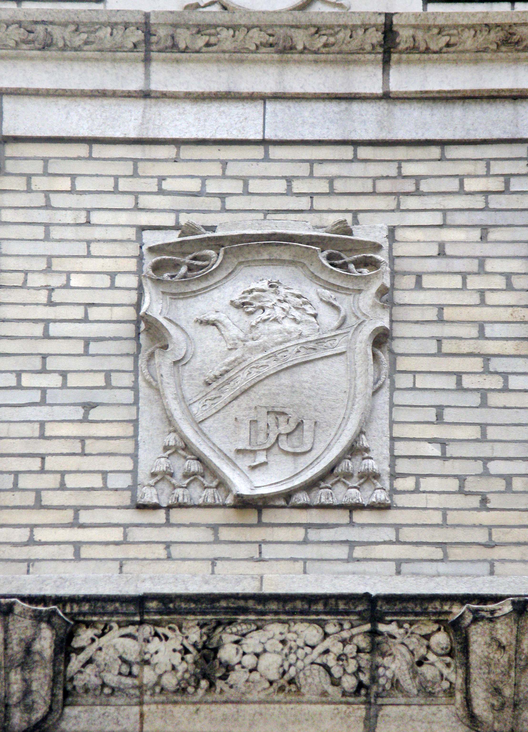 Shield, with bishop's hat; lion, and initials: DPU