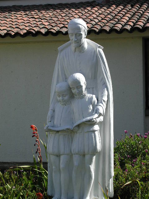 White marble statue, Vincent de Paul tutoring two children of Philippe Emmanuel Gondi; garden of Vincentian formation house, Funza, Colombia. Original model in Castleknock, Dublin.