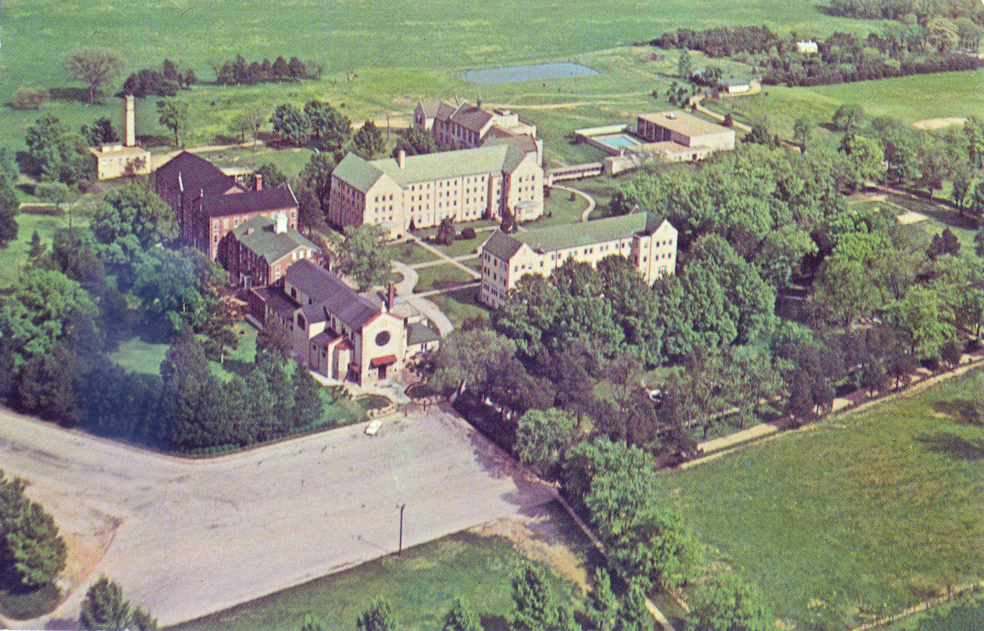 Taken before construction of church bell tower, about 1960 and after recreation center (1956).