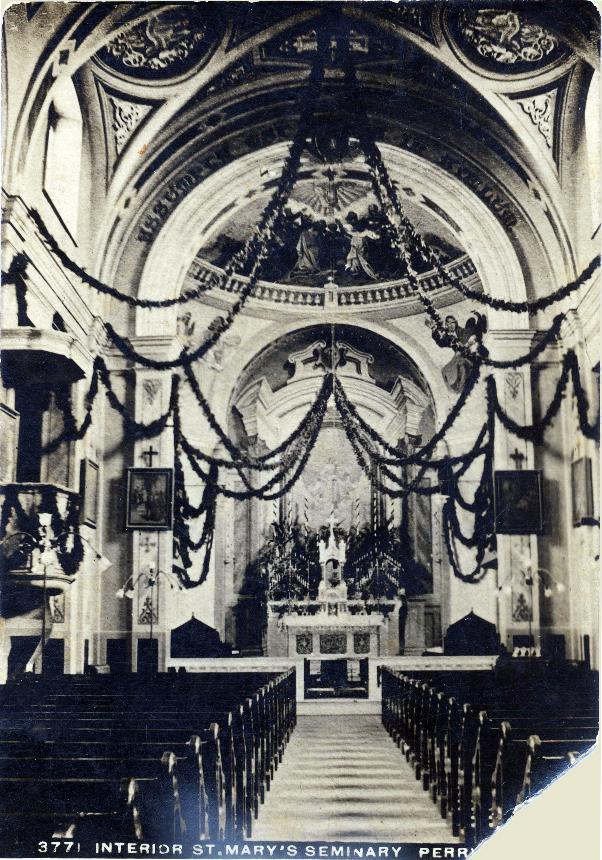 Post card; raised pulpit on left wall; large stations of the cross paintings