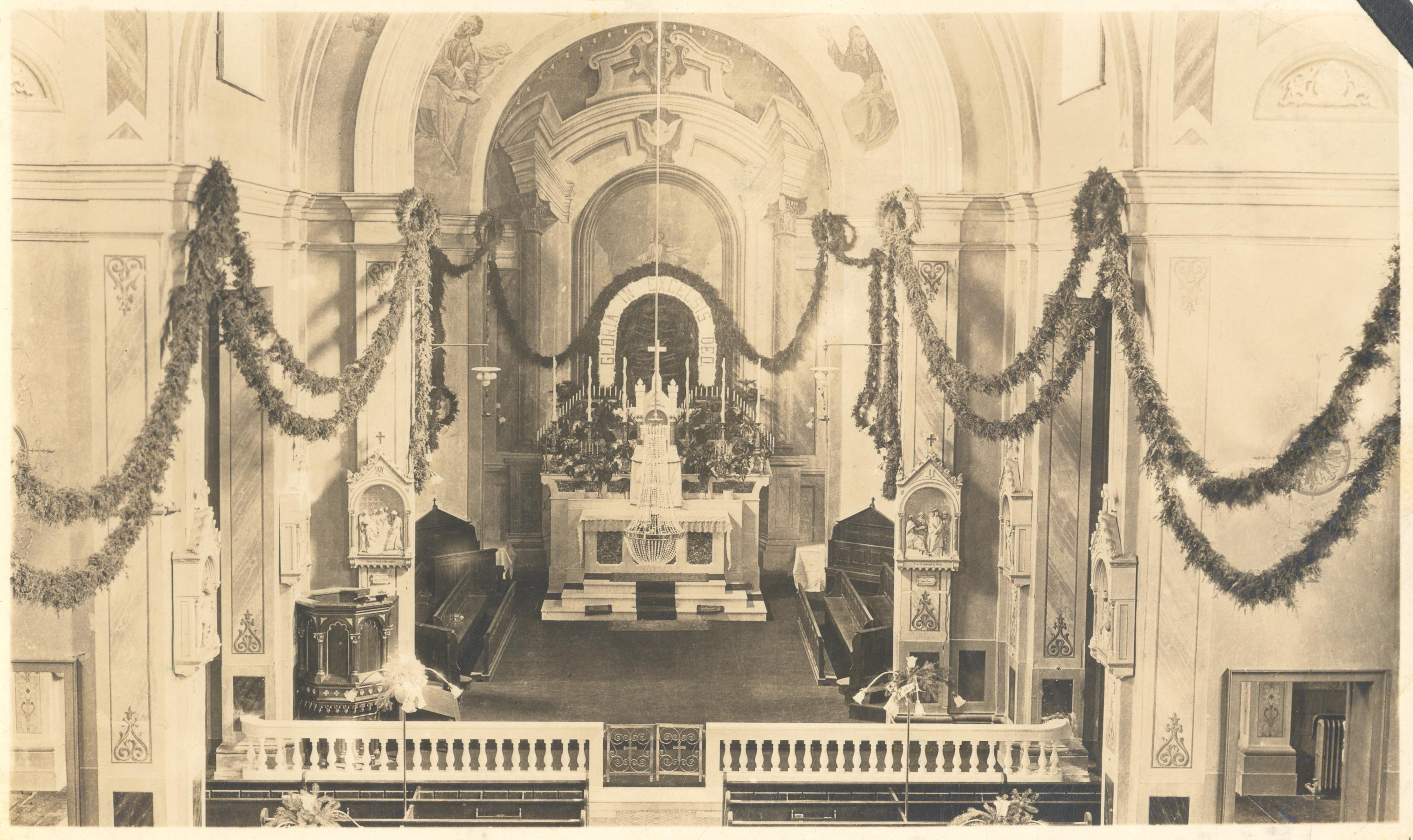 Pulpit on Gospel side; electric lights, steam heat radiator