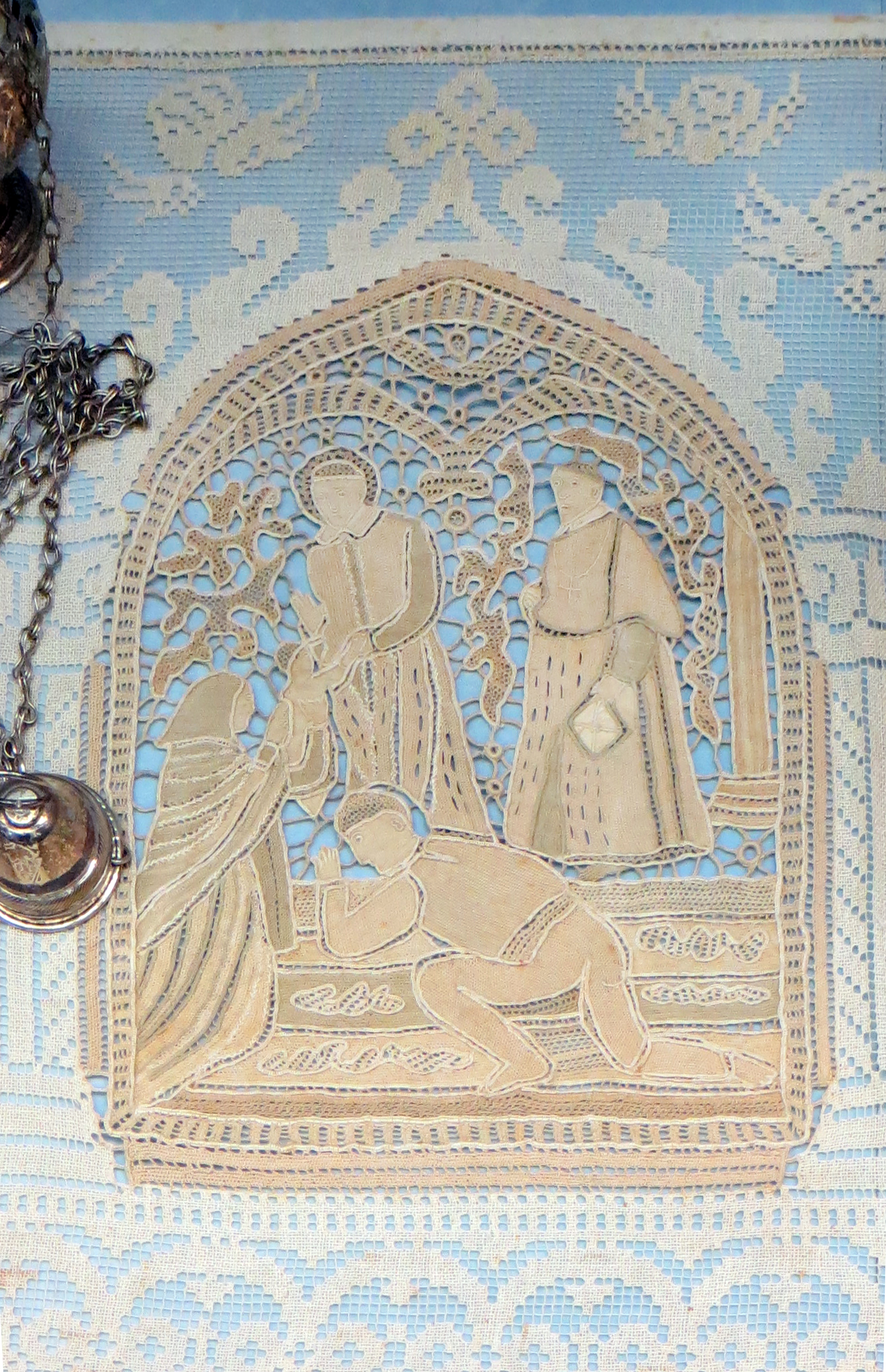 An original depiction of the supposed event, showing both man and woman (the mother), at the steps of a church Lace altar frontal