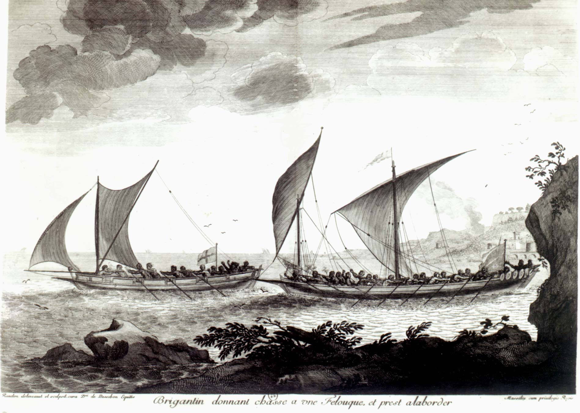 Brigantin donnant la chasse ˆ une felouque. Gravure de RANDON, pour le Chevalier de Passebon.