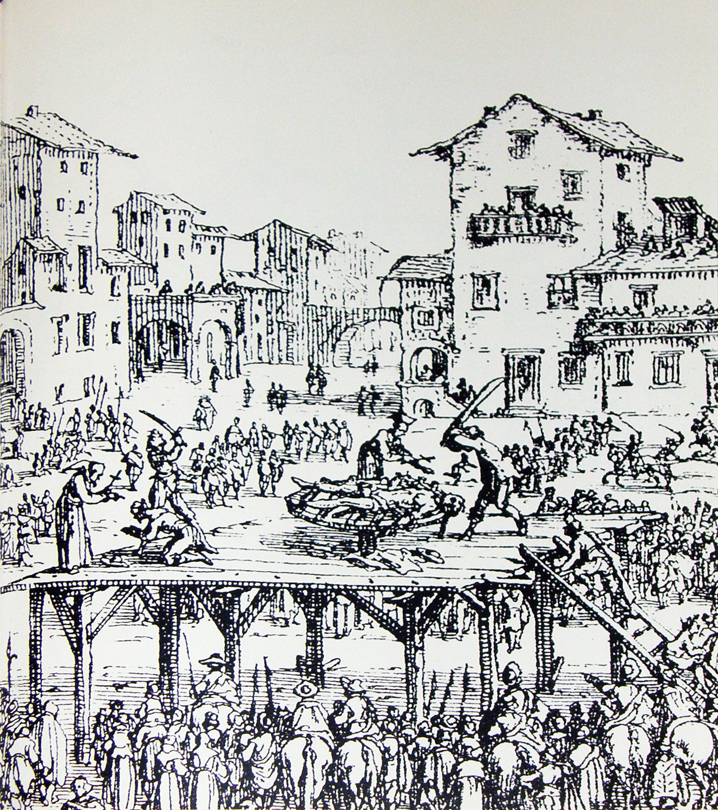 Breaking on the wheel, with a priest in cassock and biretta, holding a cross before the victim