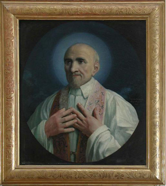 Vincent de Paul, standing, surplice, rose stole, halo, large hands; signed by artist, François Carbonnier; one of two similar compositions; dated 1866