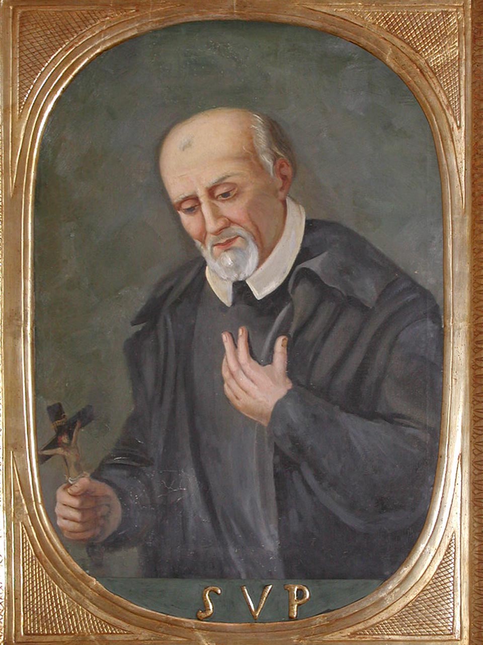 Framed oil painting; Vincent de Paul, cassock, mantle, holding crucifix, in prayer; SVP initials at bottom; original in Daughters of Charity provincial house, Naples