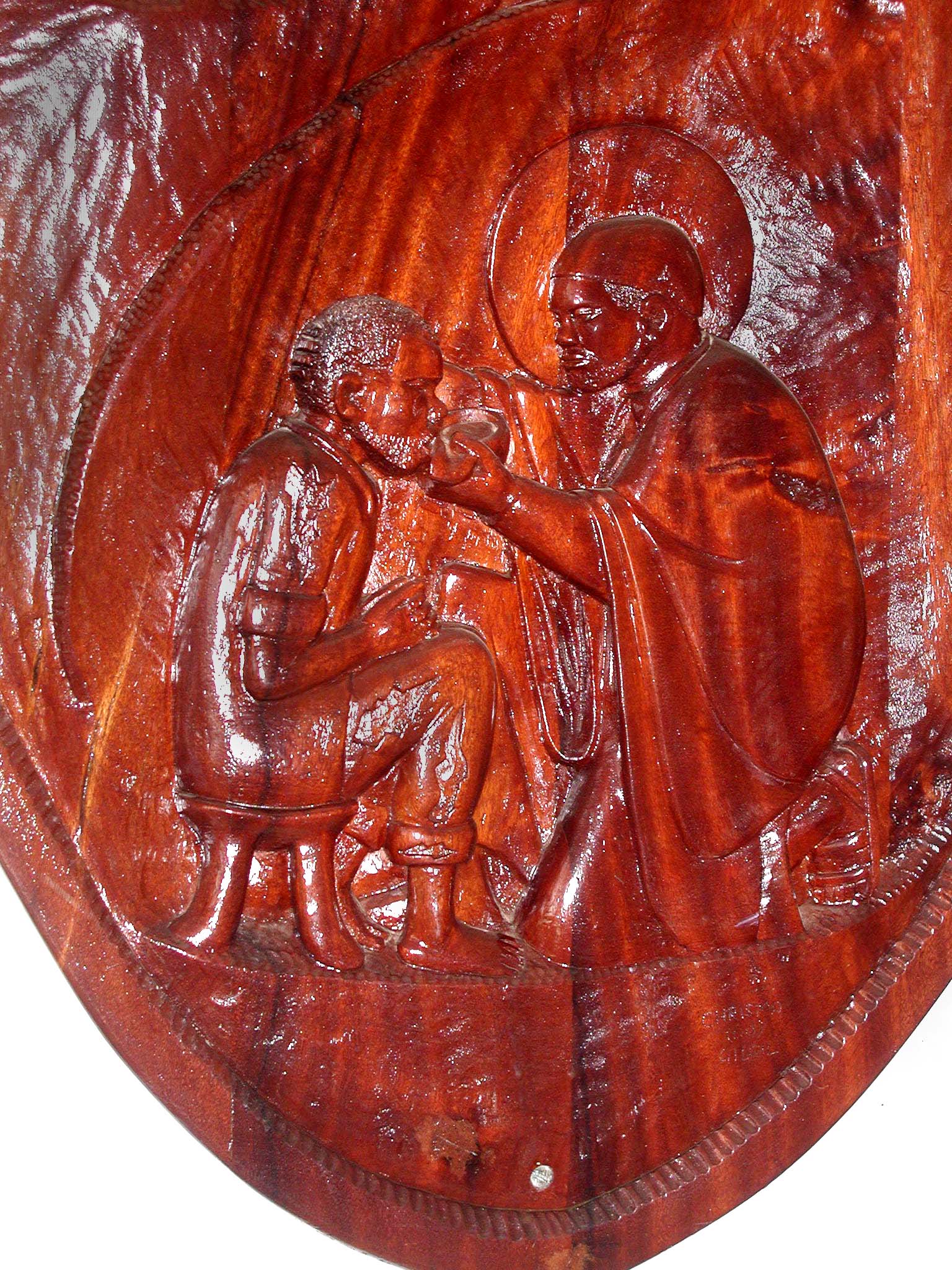 Carved wood wall plaque, Vincent de Paul, with African features, offers a drink to a poor man. Original in Vincentian house, Bp. Ravasi hall, DePaul Centre, Nairobi