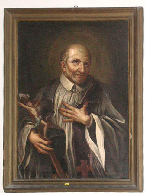 Framed oil; Vincent SVdP, cassock, surplice, violet stole; holding biretta, crucifix, gesture of prayer; original in Vincentian house, San Silvestro, Rome; other versions in Rome (convent of SS Biago e Carlo ai Catinari), Poland, Texas; I colori della carità, p. 216