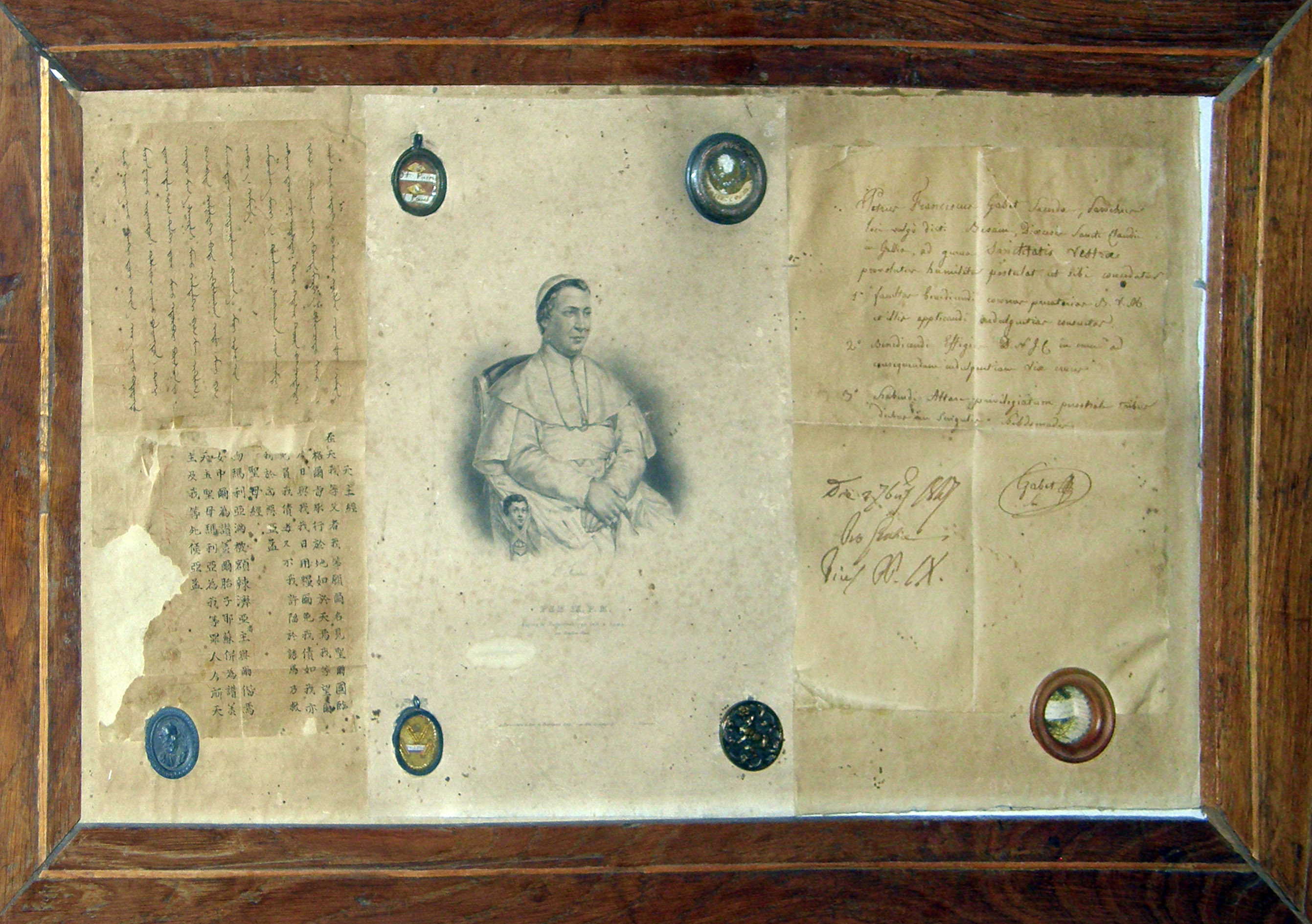 Framed souvenir, engraving of Pius IX, pope's signature on a request (rescript) from Gabet; Gabet's signature and samples of writing in Mongolian and Chinese; reliquaries; original in mother house library