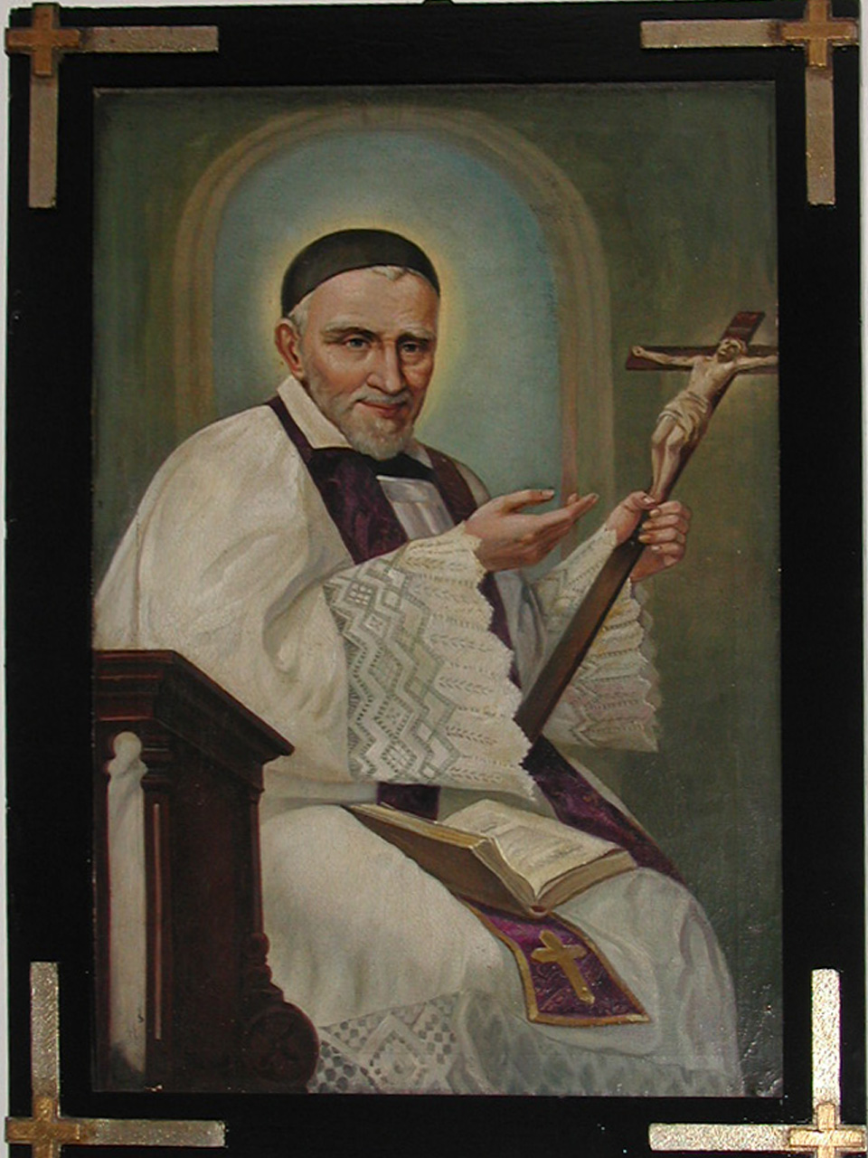 Framed oil painting, Vincent de Paul, seated, in surplice and violet stole, book on his lap, gestures toward crucifix. Original in sacristy, Vincentian provincial house, Stradom, Krakow