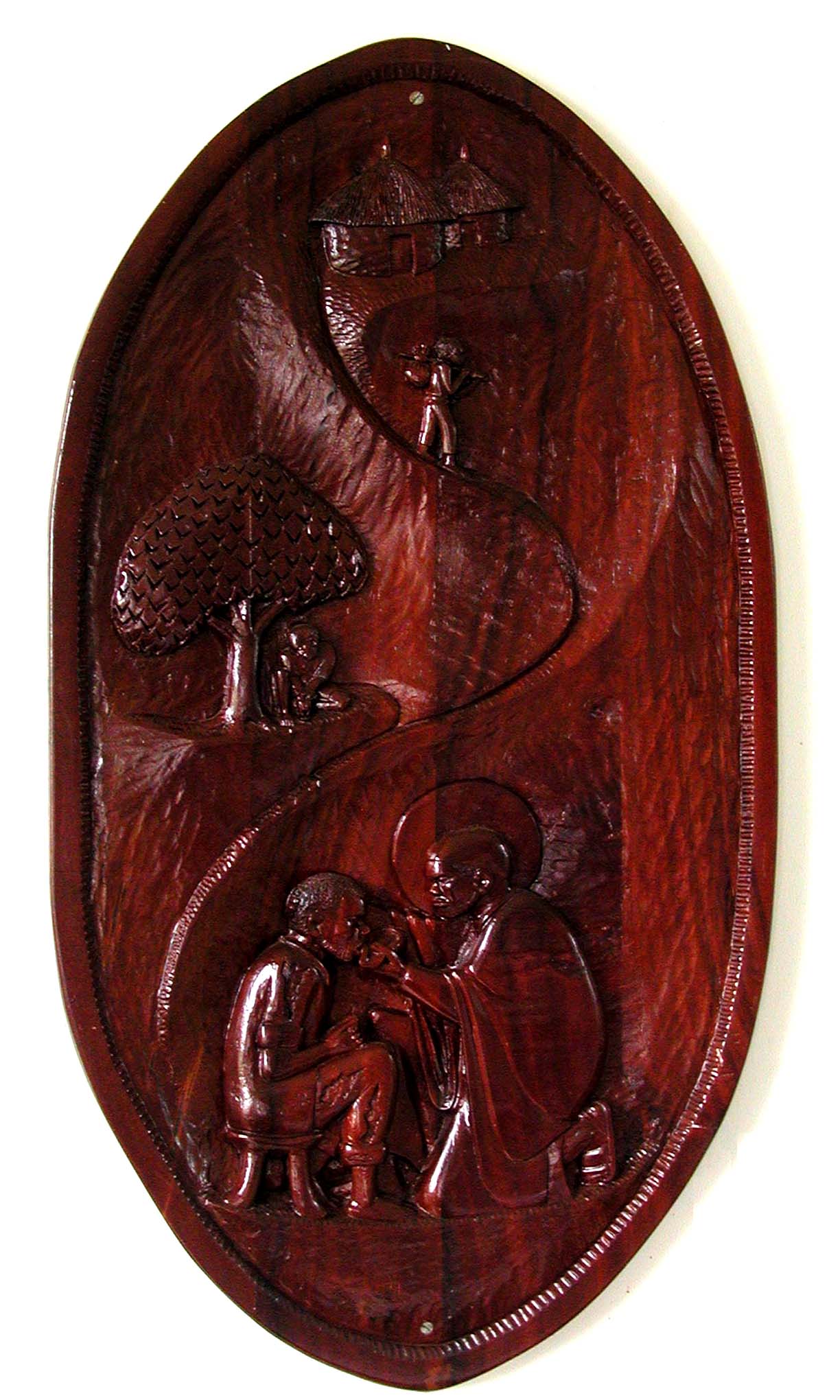 Carved wooden panel; Vincent de Paul, three scenes; helping a poor man to eat; original in Ravasi Hall, DePaul Centre, Vincentian seminary, Nairobi