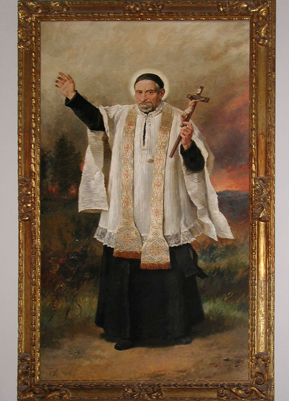 Signed, framed oil painting; Vincent de Paul in Spanish surplice, white stole; holding crucifix; artist: F. Morell, 1909. Original in Vincentian house, Palma de Mallorca