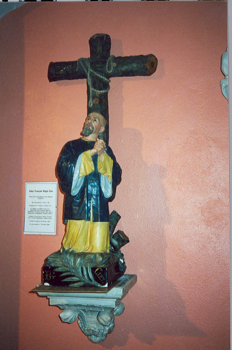 Said to be the original statue of Francis Clet, kneeling before a cross, palm of martyrdom at his feet. Dressed in imperial yellow, an impossible color.