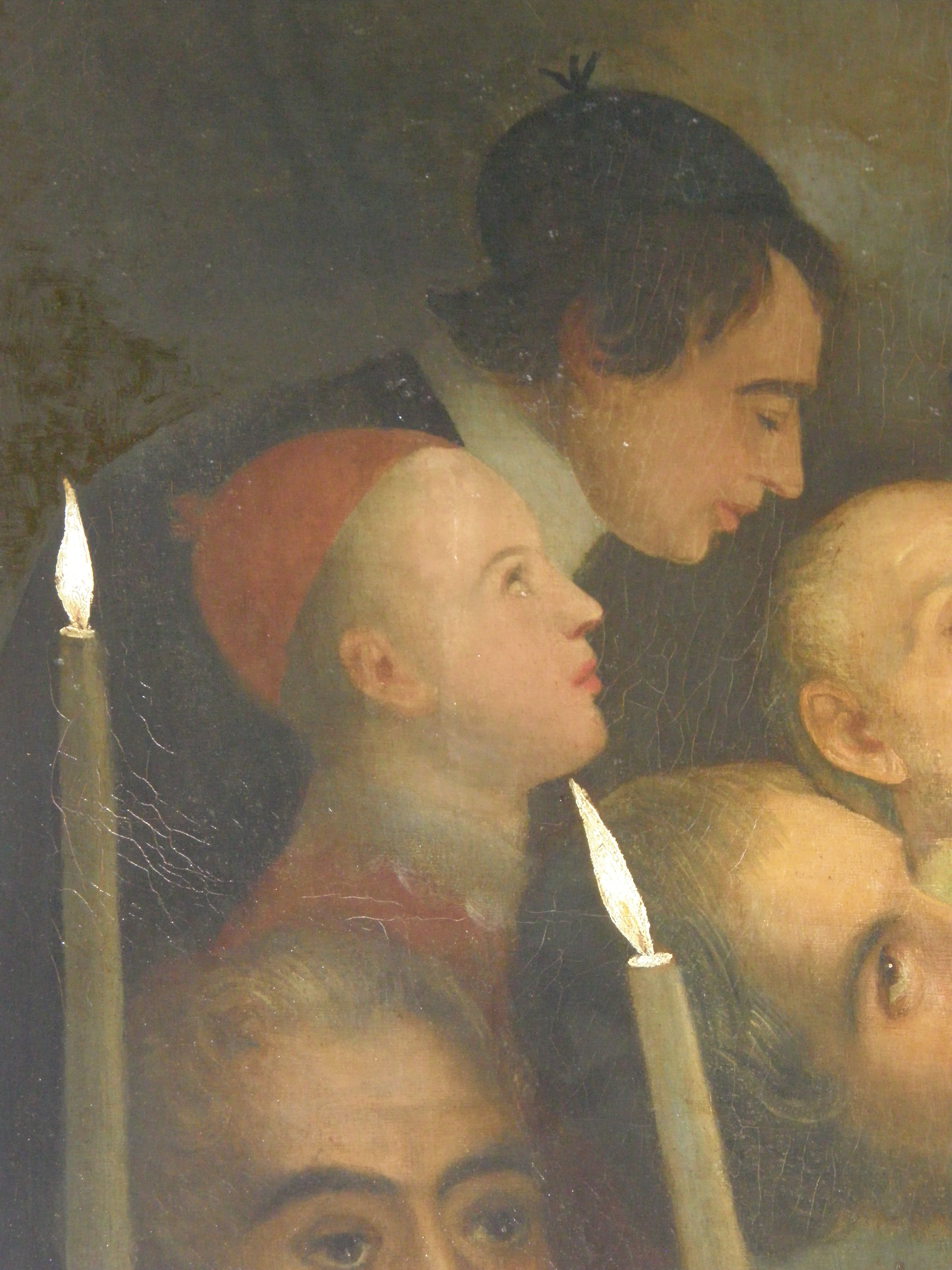 Original painting in Vincentian mother house, artist Bro. Carbonnier; painting of death of Vincent de Paul choir boy or server with red skullcap; Vincentian with black skullcap