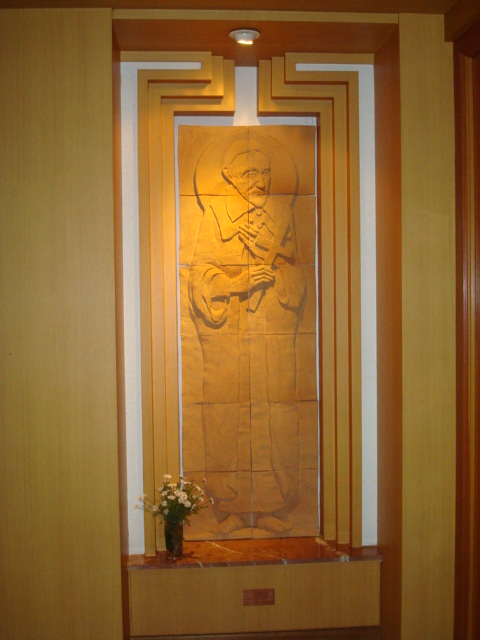 Wall plaque, terra cotta, Vincent de Paul holding cross; original in Sisters of Charity mother house, Suwon