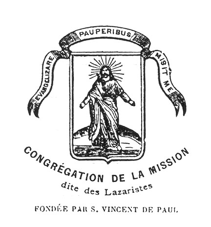 Shape of a shield, motto on ribbon above