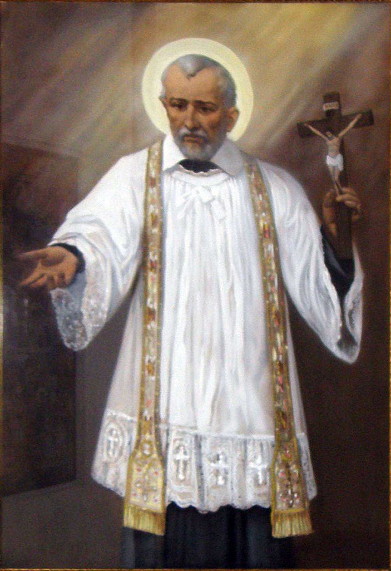 Vincent de Paul, standing, cassock, surplice, stole, halo, holding crucifix toward viewer; painting in background, rays from above; original in Vincentian provincial house, Germantown