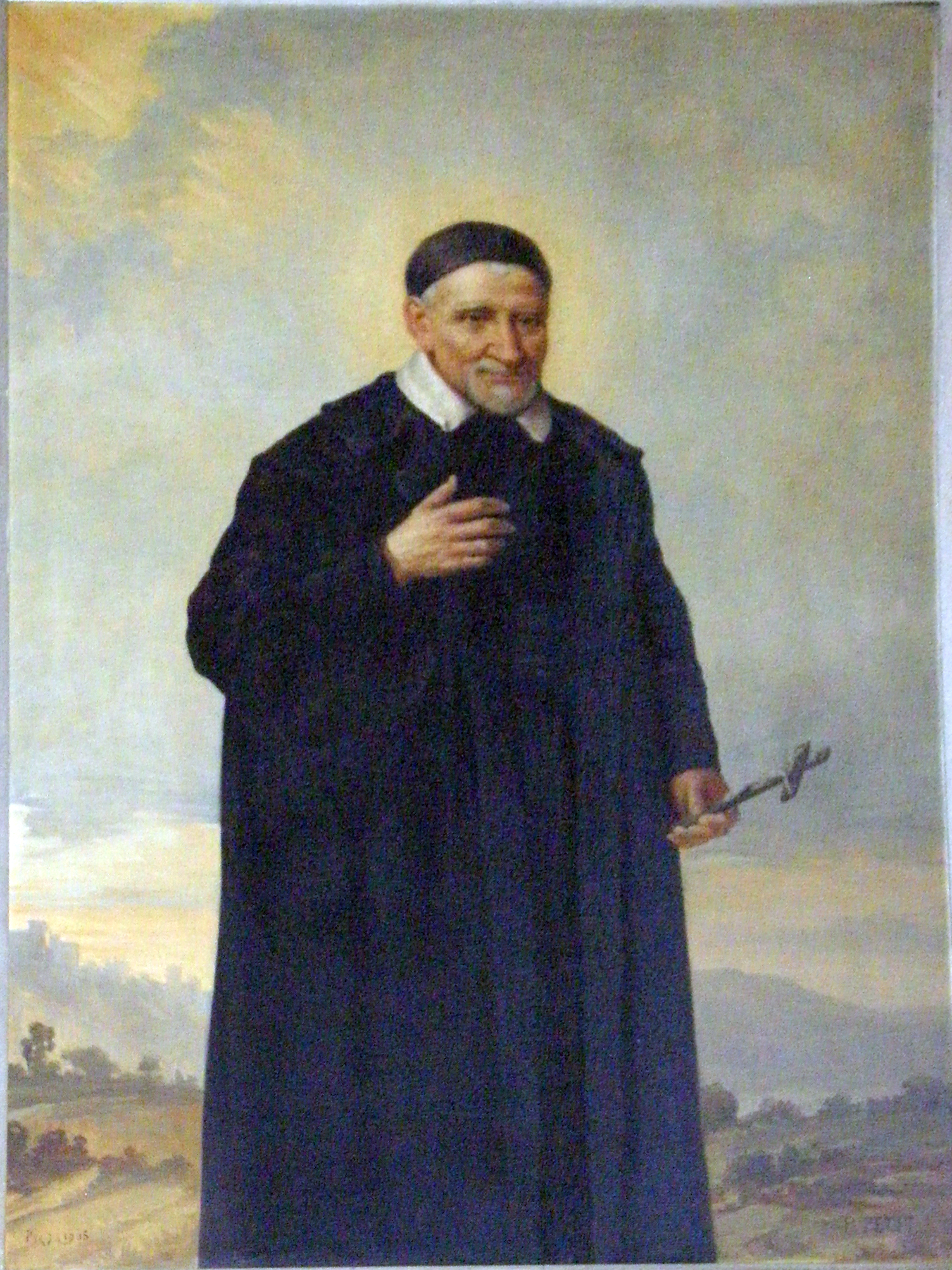 Oil on canvas; Vincent de Paul, standing, cassock, mantle, skullcap, holding small crucifix; in open country. Original at CM parish, Phibsborough, Dublin