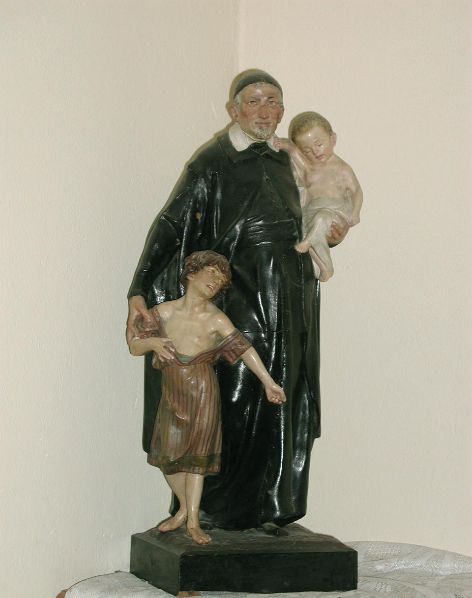 Wooden statue, painted, Vincent de Paul and two children; Spanish style; original in Vincentian house, La Ceiba