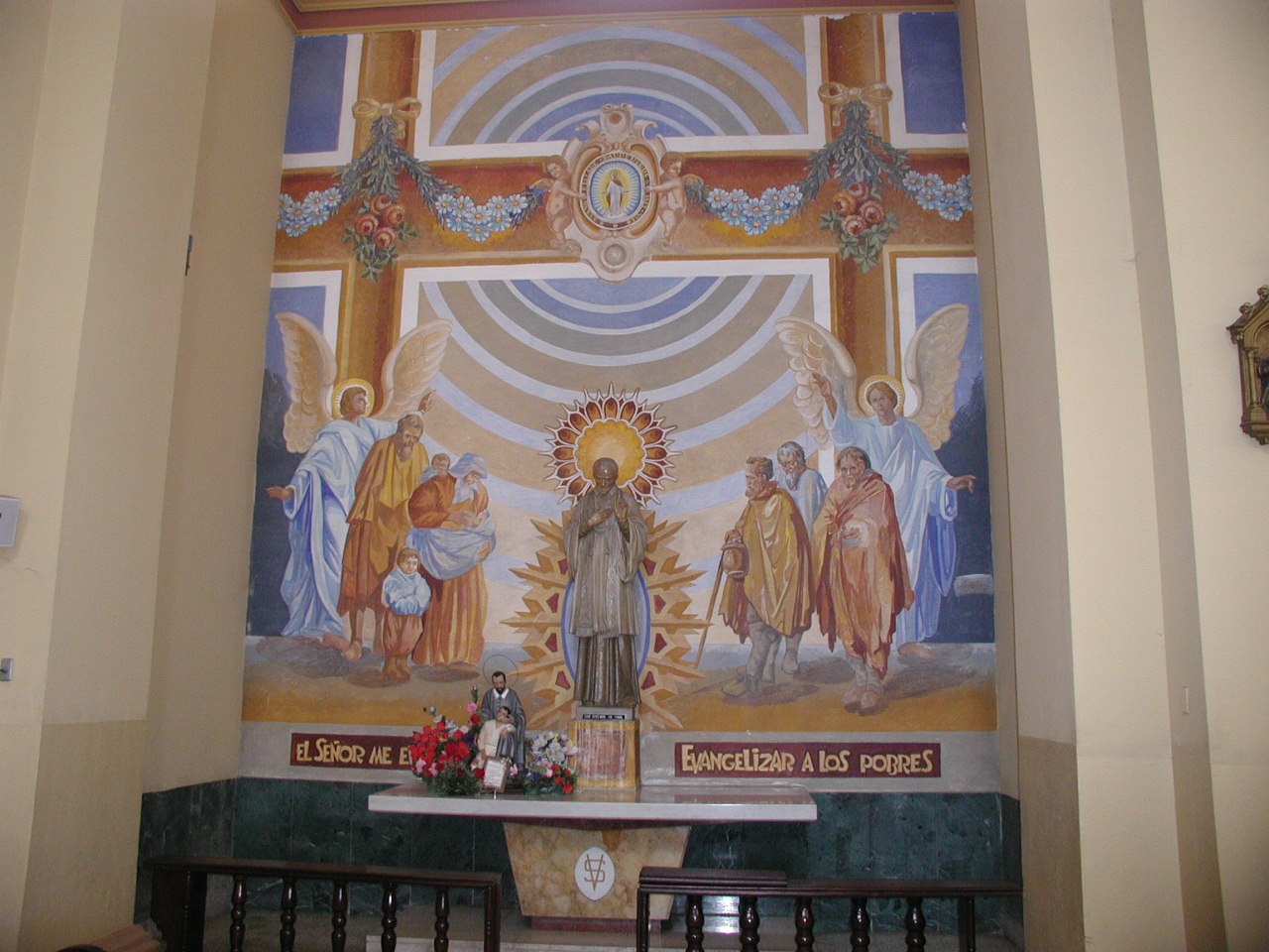Side altar, Vincent de Paul with poor, angels; emblem of Congregation above; Vincentian motto by altar. Cathedral, San Pedro Sula