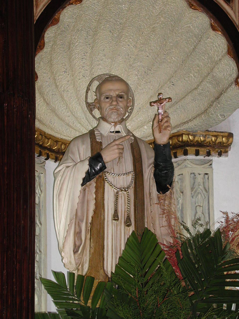 Altar statue, second view, of Vincent de Paul pointing to crucifix; serious expression. Original in Vincentian parish, Leon, Nicaragua