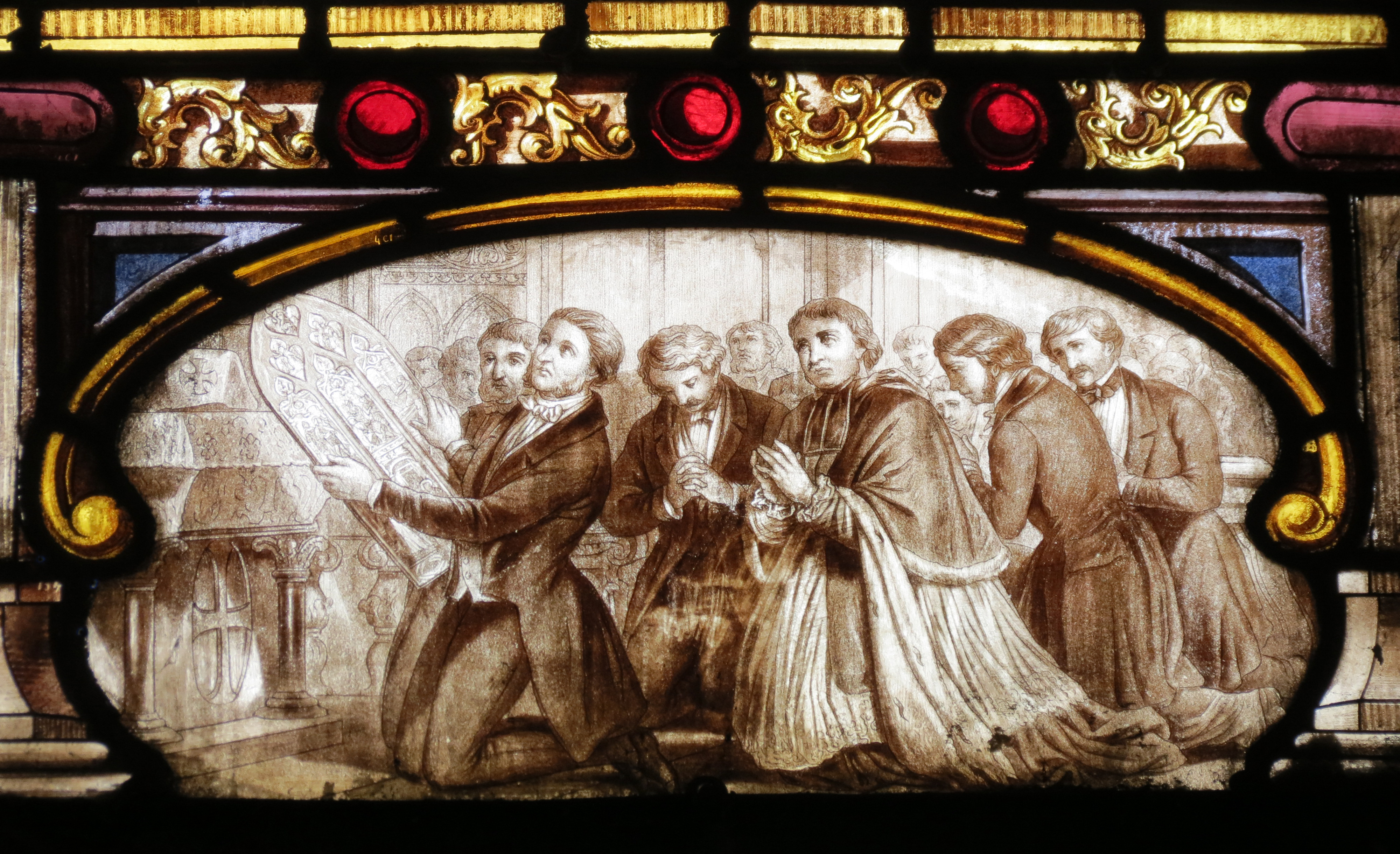 Ozanam and his companions, with a bishop (or a canon?) offering a window. Detail from a SVdP window.