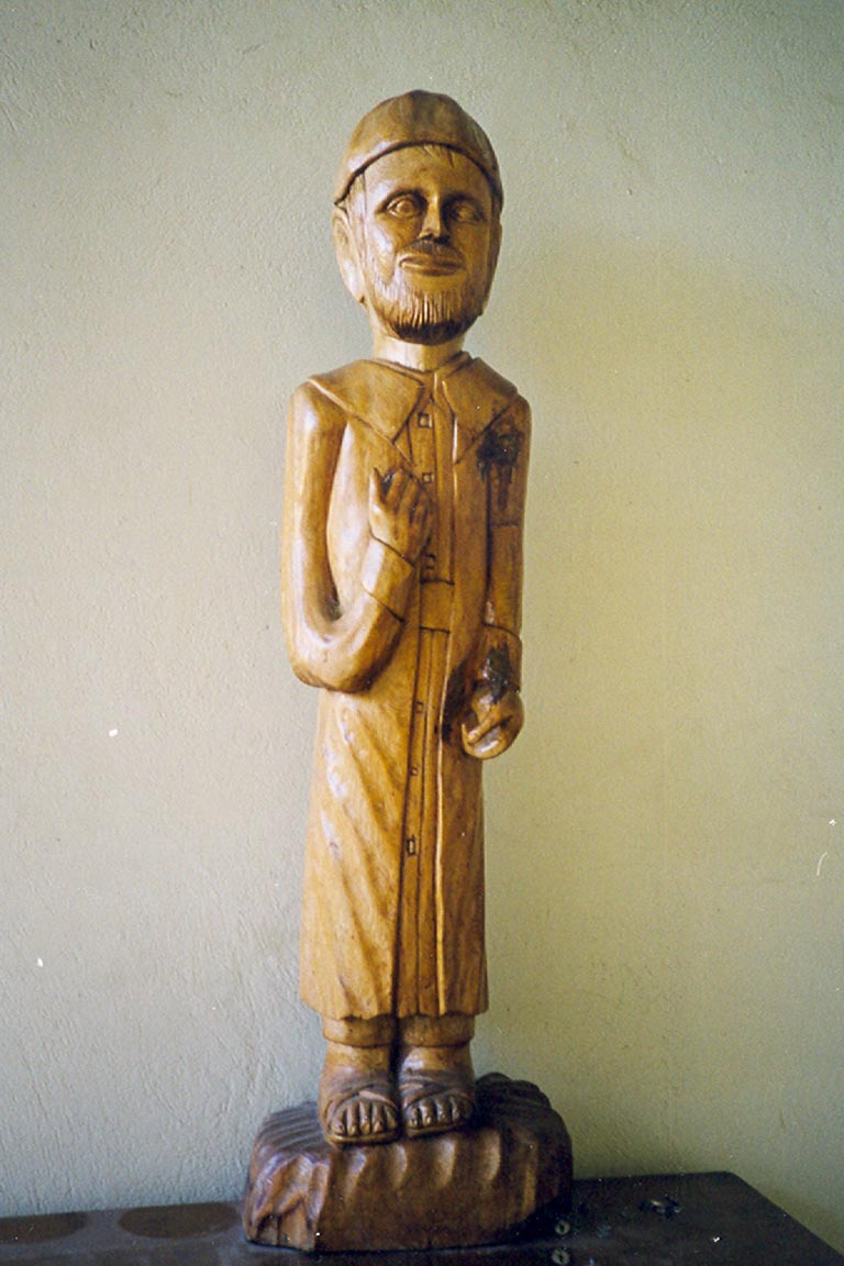 Carved wooden statue, Vincent de Paul, carrying gourd (?), original in Vincentian house, Port au Prince