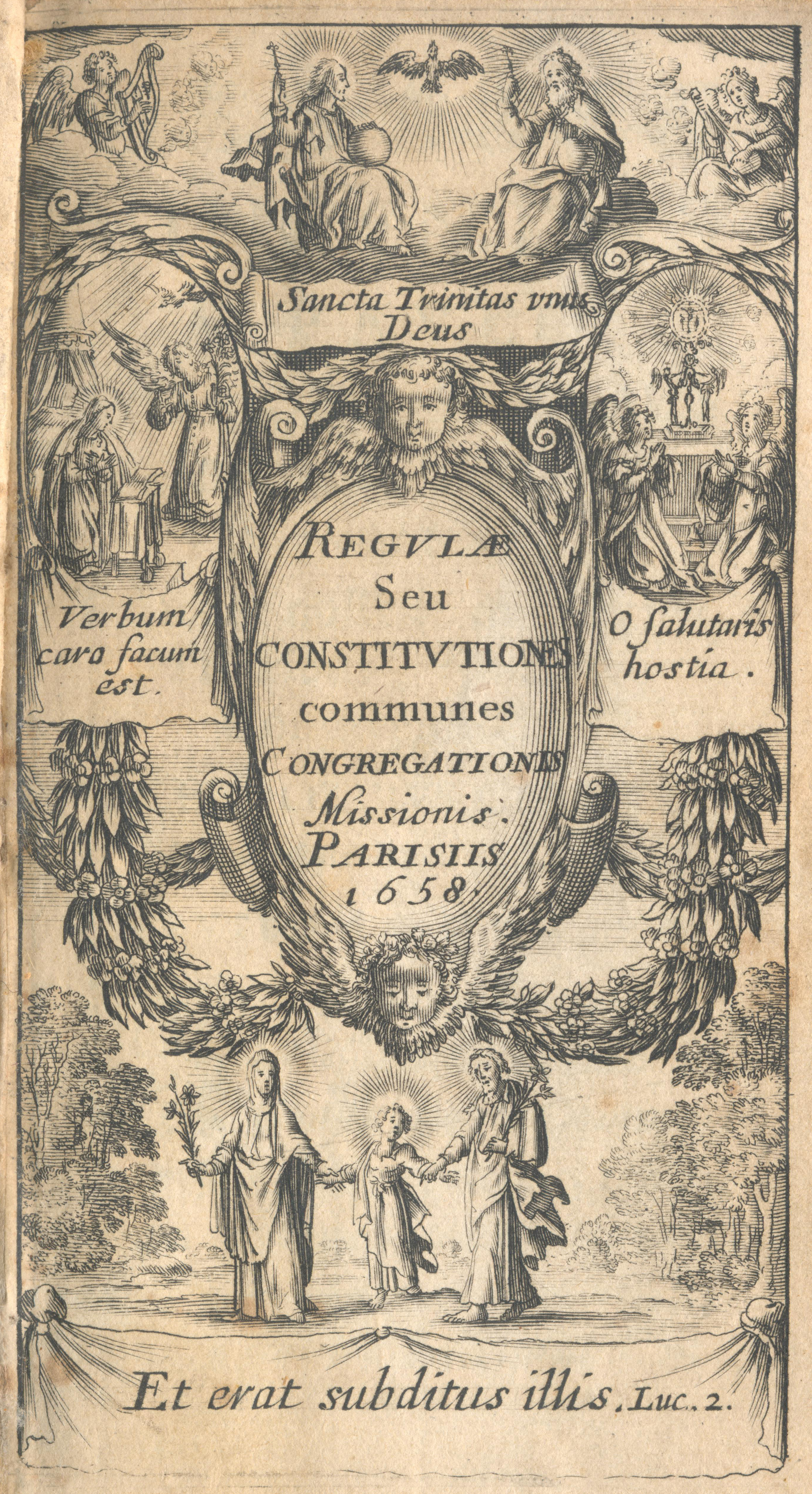 Depicts symbols of Holy Trinity, Incarnation (left), Eucharist (right), obedience (below), decorated with angels, Latin texts