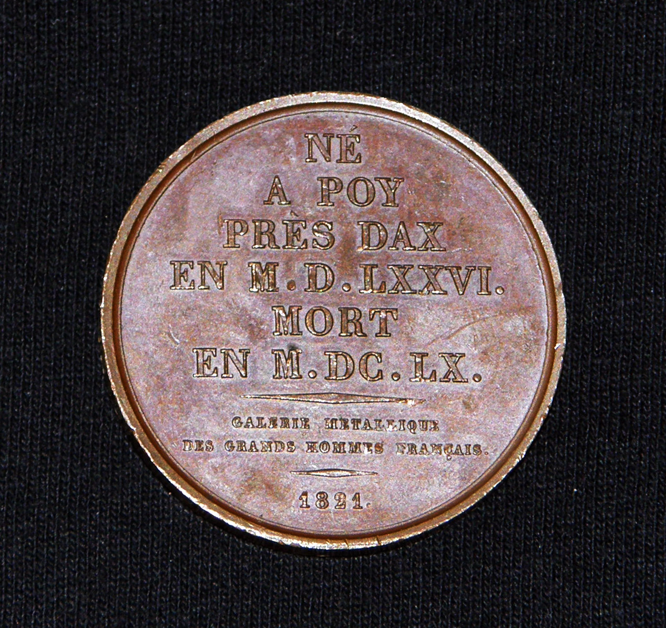 Text: Born at Poy [sic] near Dax in 1576, died in 1660. "Metallic gallery of great Frenchmen." 1821, title of a series of 17 executed by Gatteaux.