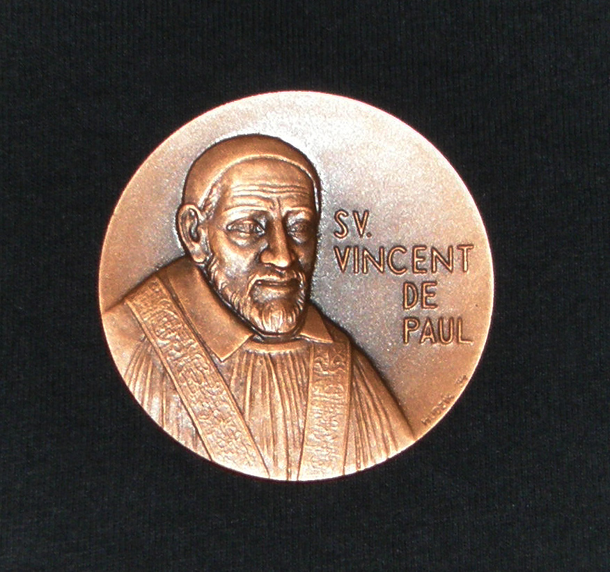 Bronze medallion; Vincent de Paul, cassock, surplice, stole, skullcap; inscription