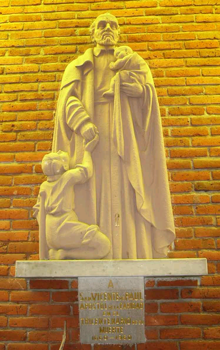 Statue group, Vincent de Paul with two children; on marble slab, inscription below, brick background; original in Vincentian provincial house, Mexico City