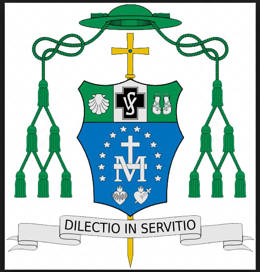 Motto: Dilectio in servitio (Love in service); emblem of the Miraculous Medal (reverse), SV [Saint Vincent] cross, emblems of pilgrims to Santiago de Compostela (shell, sandals)