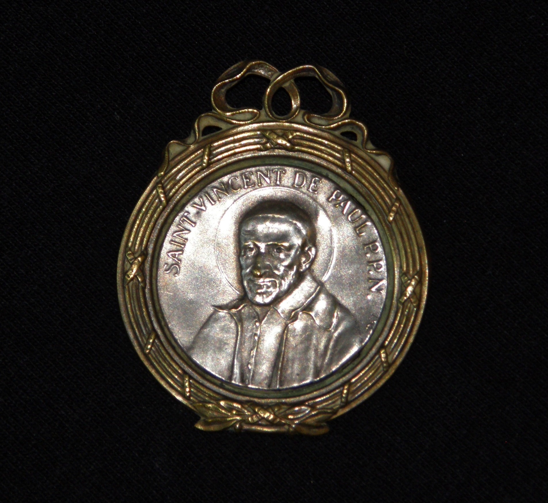 Brass framed silver medallion, VIncent de Paul, cassock, mantle, skullcap, halo; text, PPN = pray for us.