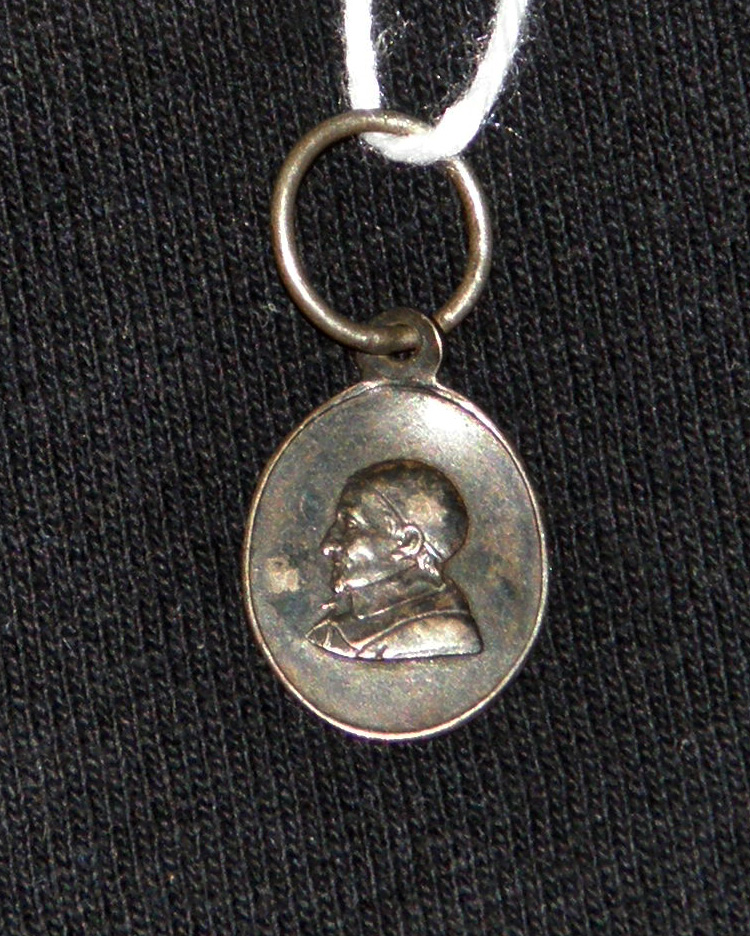 Oval medal, silver, with loop and ring; for orphan identification; Vincent de Paul profile bust, cassock, mantle, skullcap