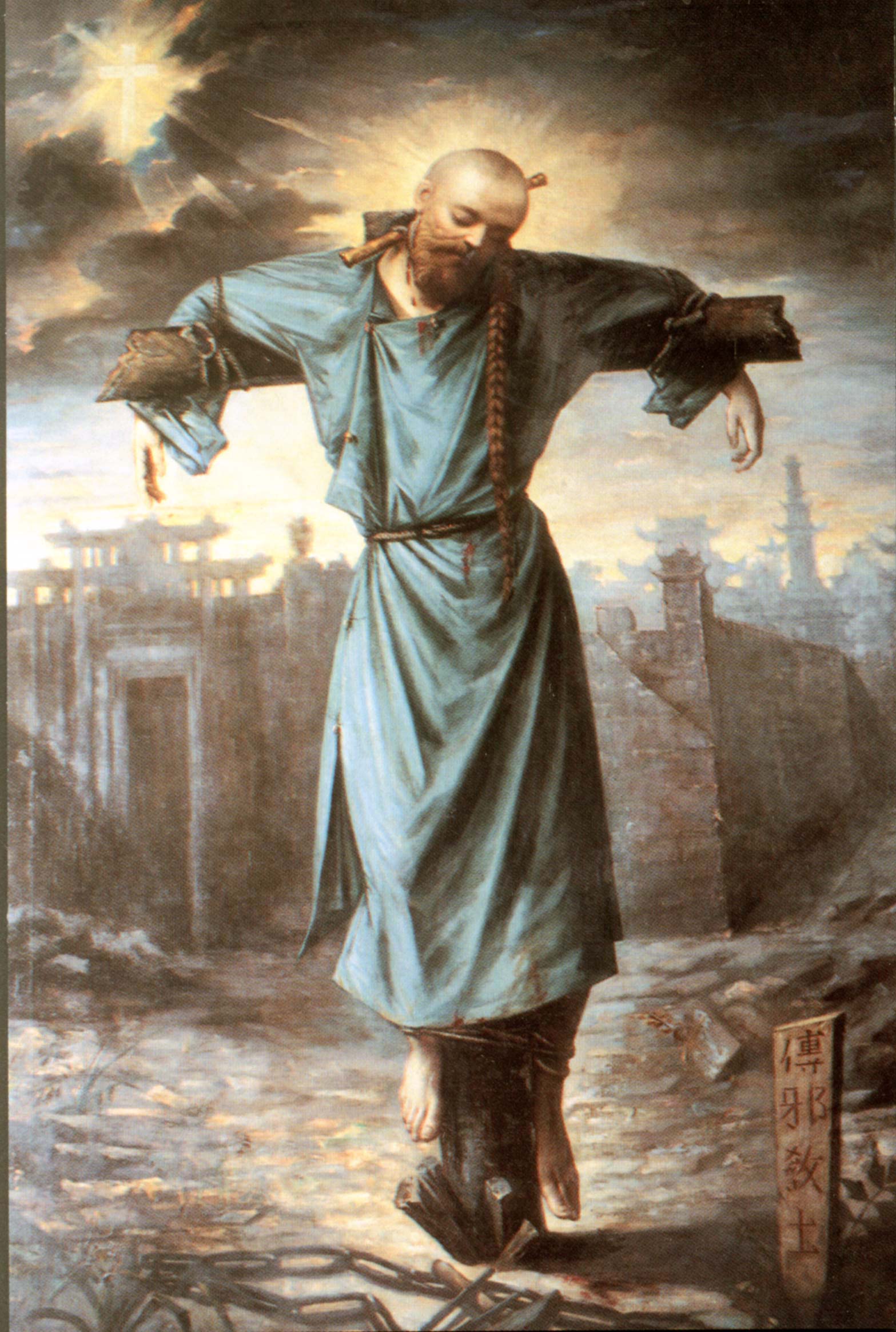 This is the original painting, signed by Pierre Petit; prepared for the beatification, and probably brought to Rome for the ceremonies. Chinese text: "Preacher of a false religion."