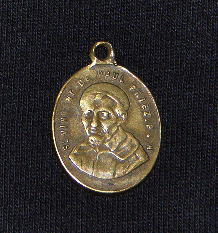 Oval copper medal, with loop; Vincent de Paul bust, cassock, mantle, skullcap; French text: St. Vincent de Paul, Pray f[or] u[s]