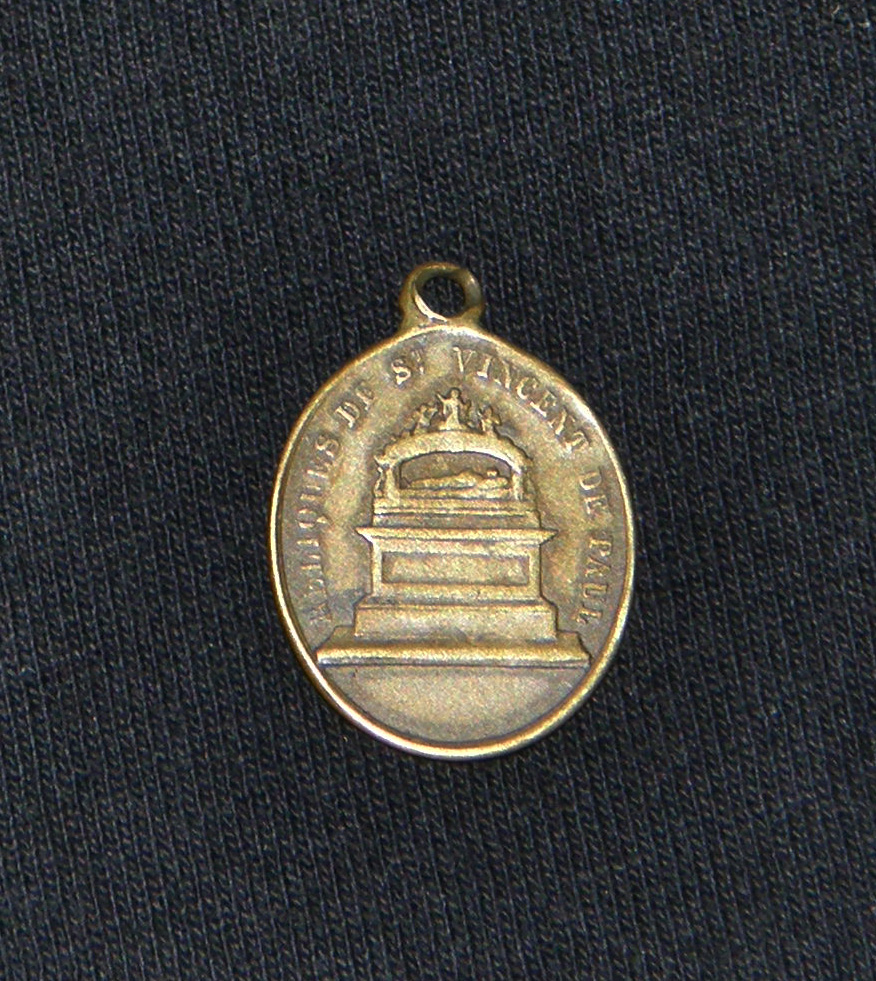 Reverse, with reliquary shrine (Vincent de Paul depicted with head to the right, opposite of actual position), text; probably from 1830 transfer of his relics to Vincentian mother house, Paris