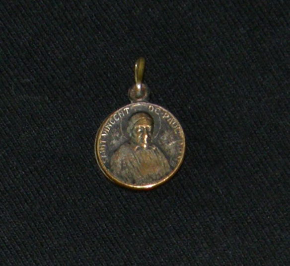 Obverse, silvered copper, round medal with loop and ring, Vincent de Paul, cassock, surplice, skullcap, halo, French text: PPN, pray for us; cover for a small reliquary