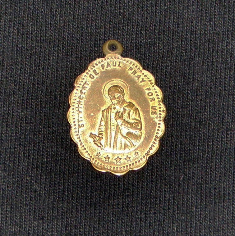 Obverse, oval copper medal with loop; Vincent de Paul, cassock, mantle, hat under left arm, skullcap, halo, holding crucifix; English text