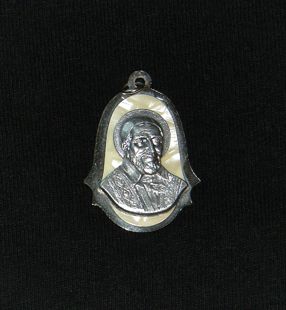 Obverse, bell-shaped medal, loop, ring; Vincent de Paul bust, cassock, surplice, stole, skullcap, halo, on pale bakelite backing; reverse: St. Christophe Protegez Nous. Italy