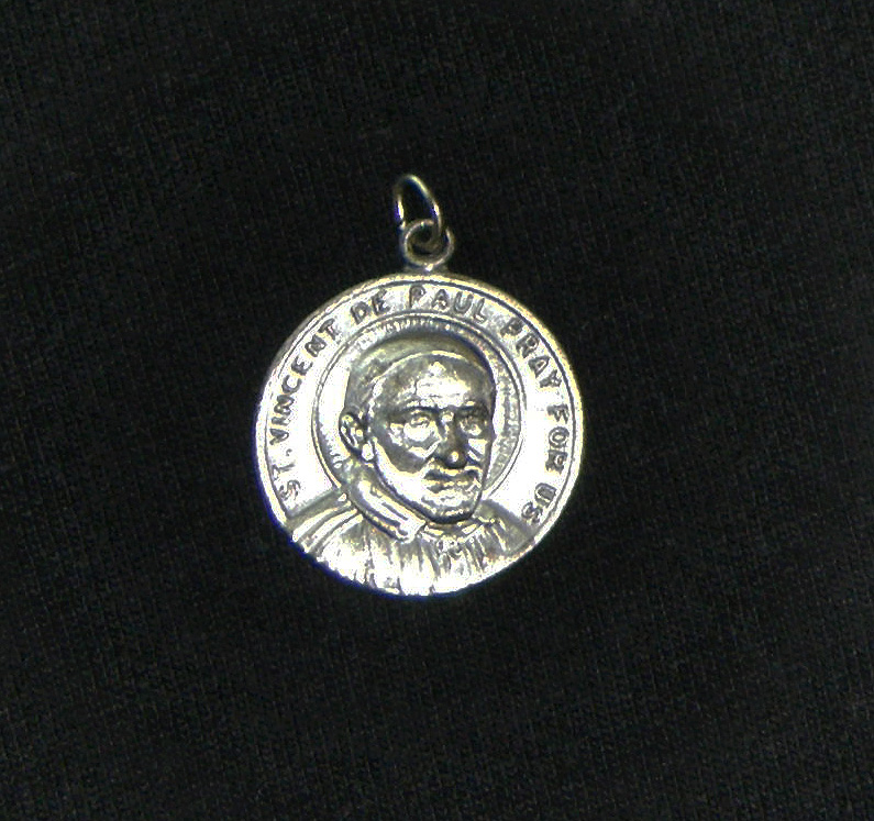 Obverse, round medal, loop and ring; head of Vincent de Paul, cassock, surplice, skullcap, halo; English text; reverse, Louise de Marillac