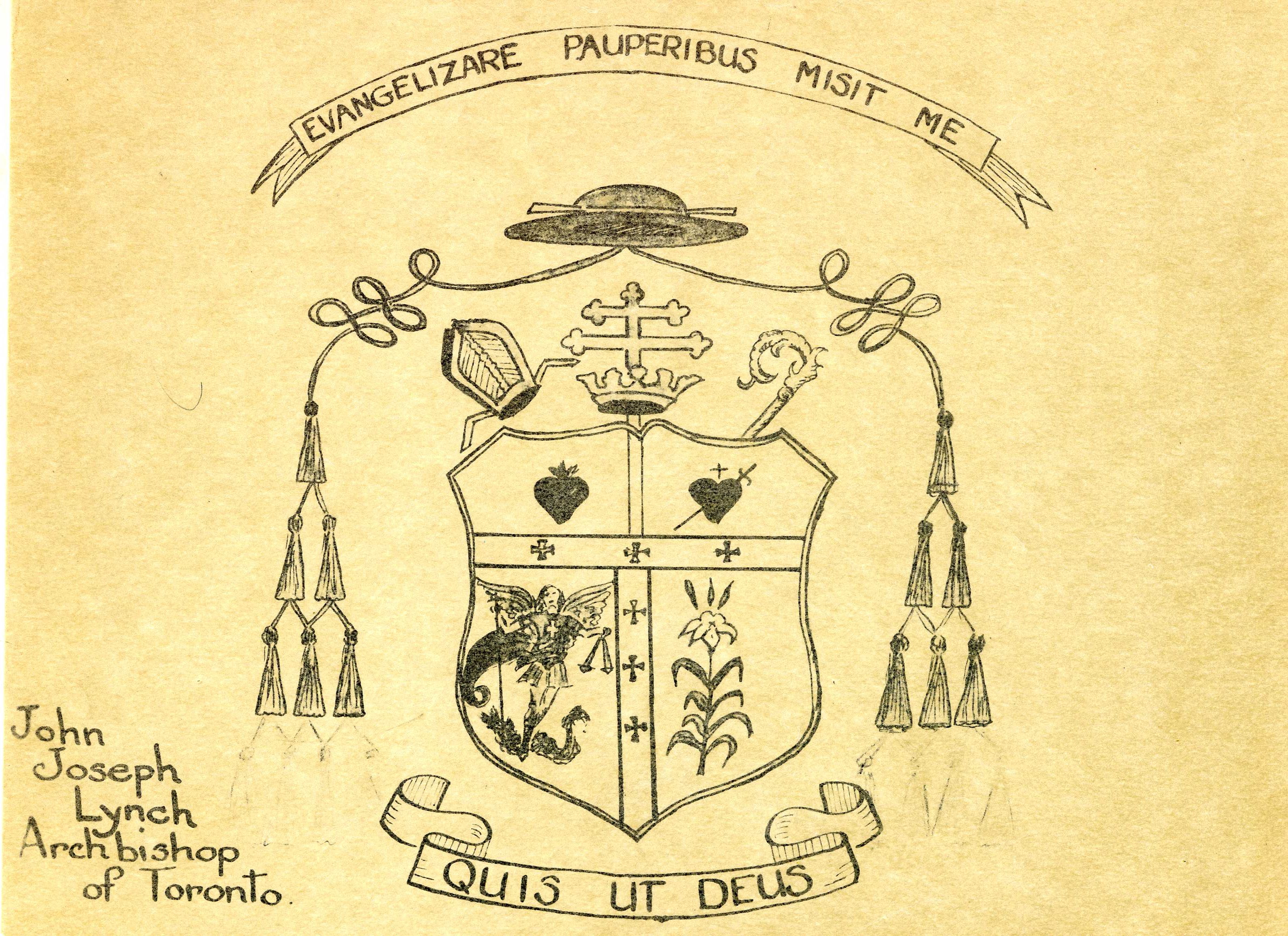 Another version: lower motto: Who is like God? (From meaning of Hebrew Mi-ca-el); Michael the archangel in shield, defeating dragon; coronet above shield; hearts of Jesus and Mary; lily (of Mary)