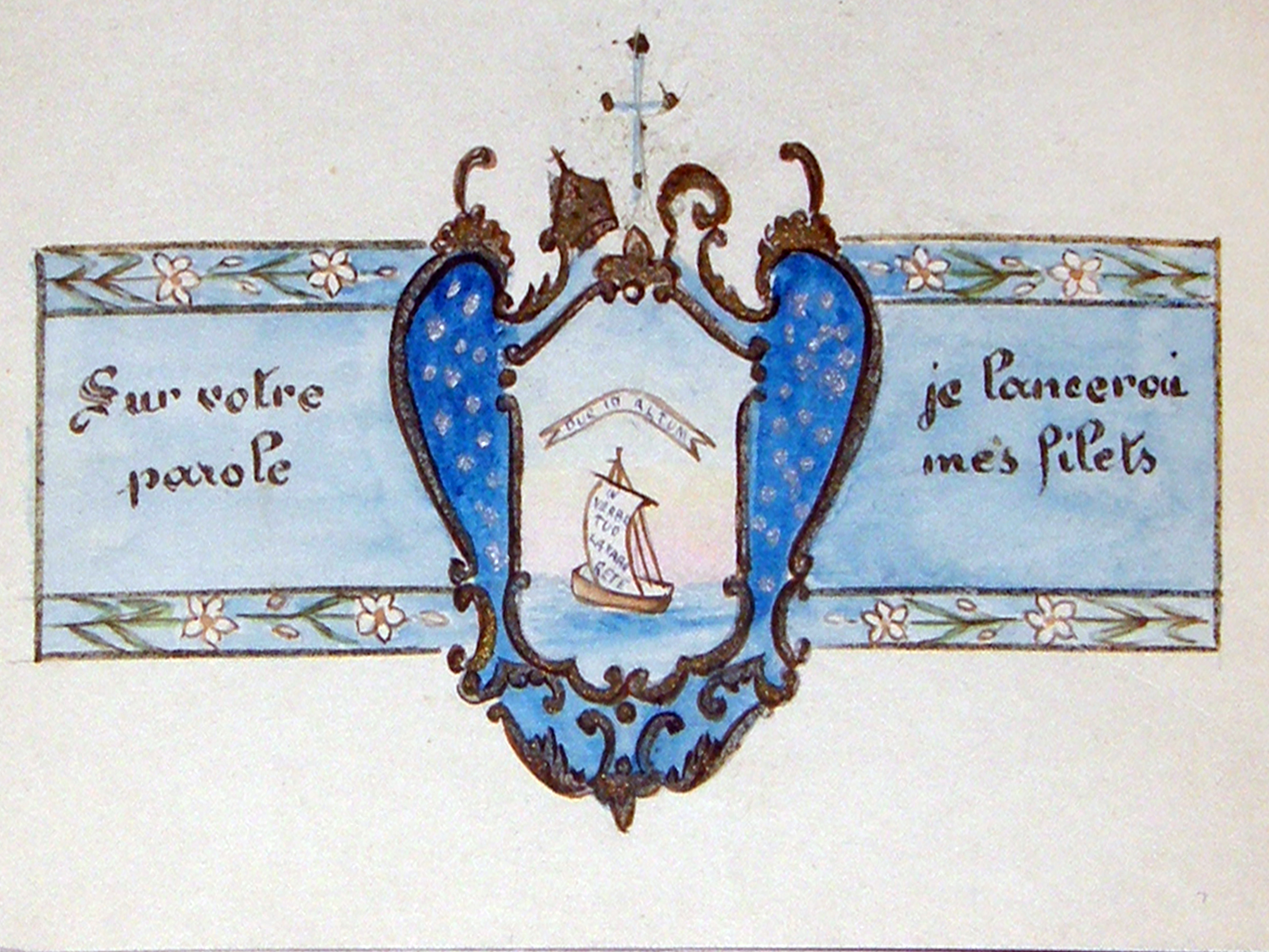 Vicar apostolic of Beijing, China; motto: At your word, I will set my nets (in French, Latin); prepared for adaptation as a shield, by Sr. Anne Marie Raymond.