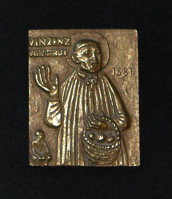 Rectangular bronze plaque, obverse, Vincent de Paul, cassock, surplice, skullcap, halo; holding basked with bread; child (?) crouching at left; German text; German manufacture
